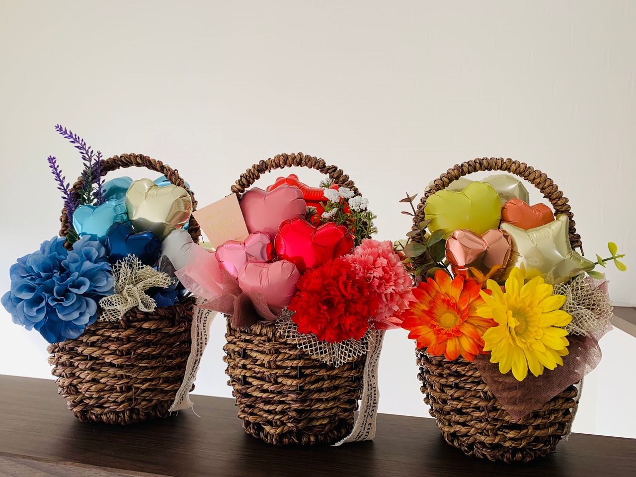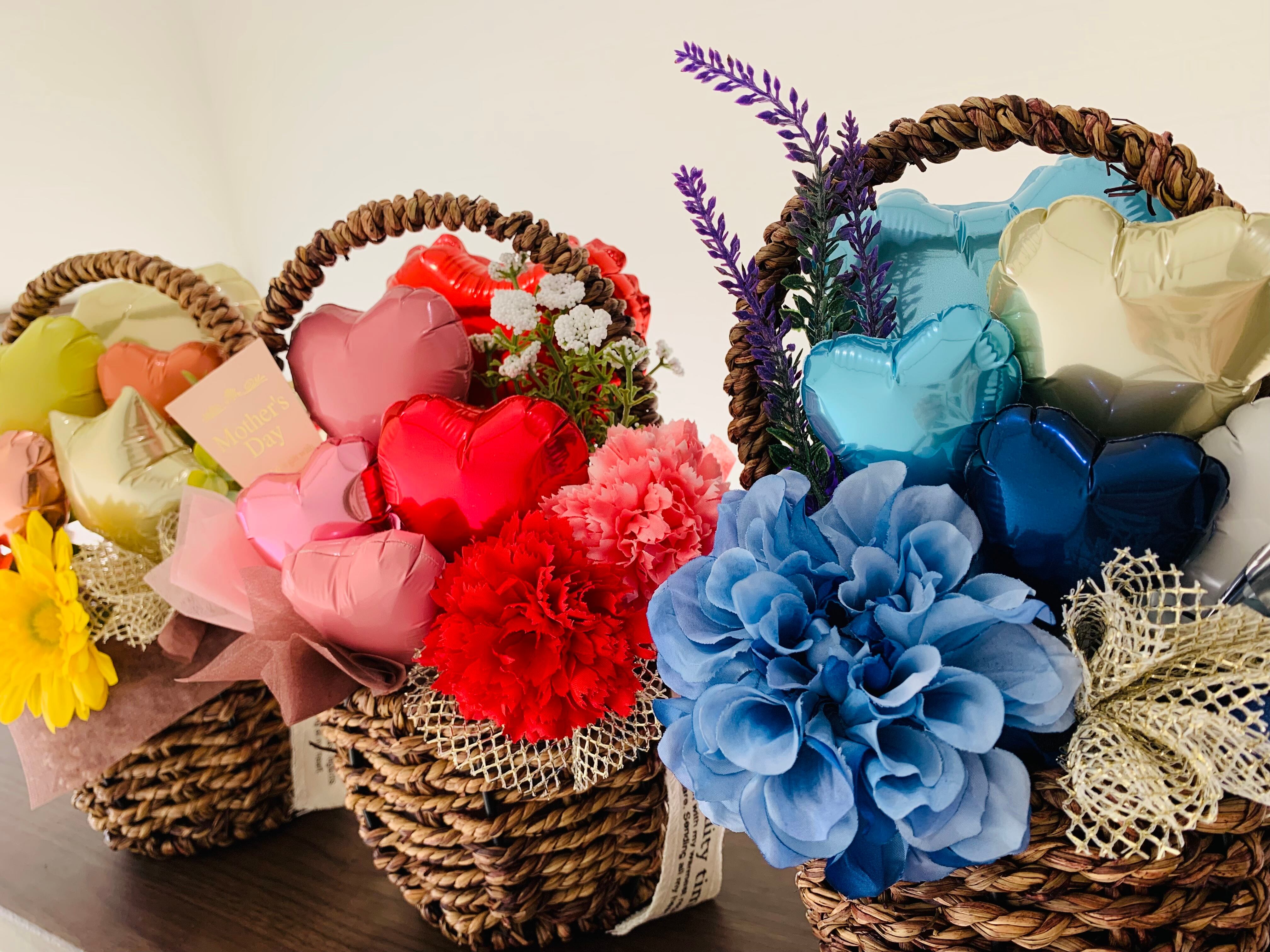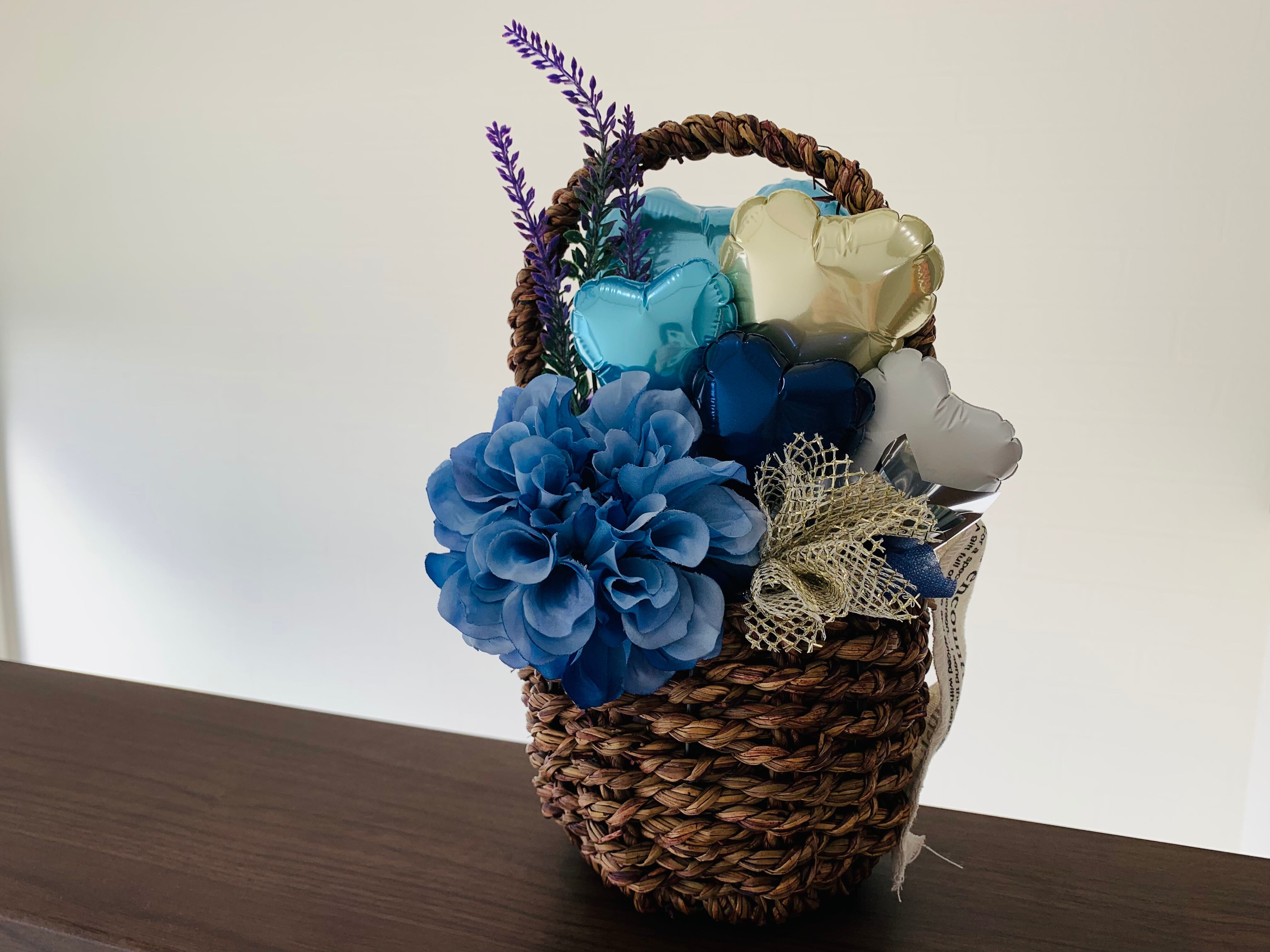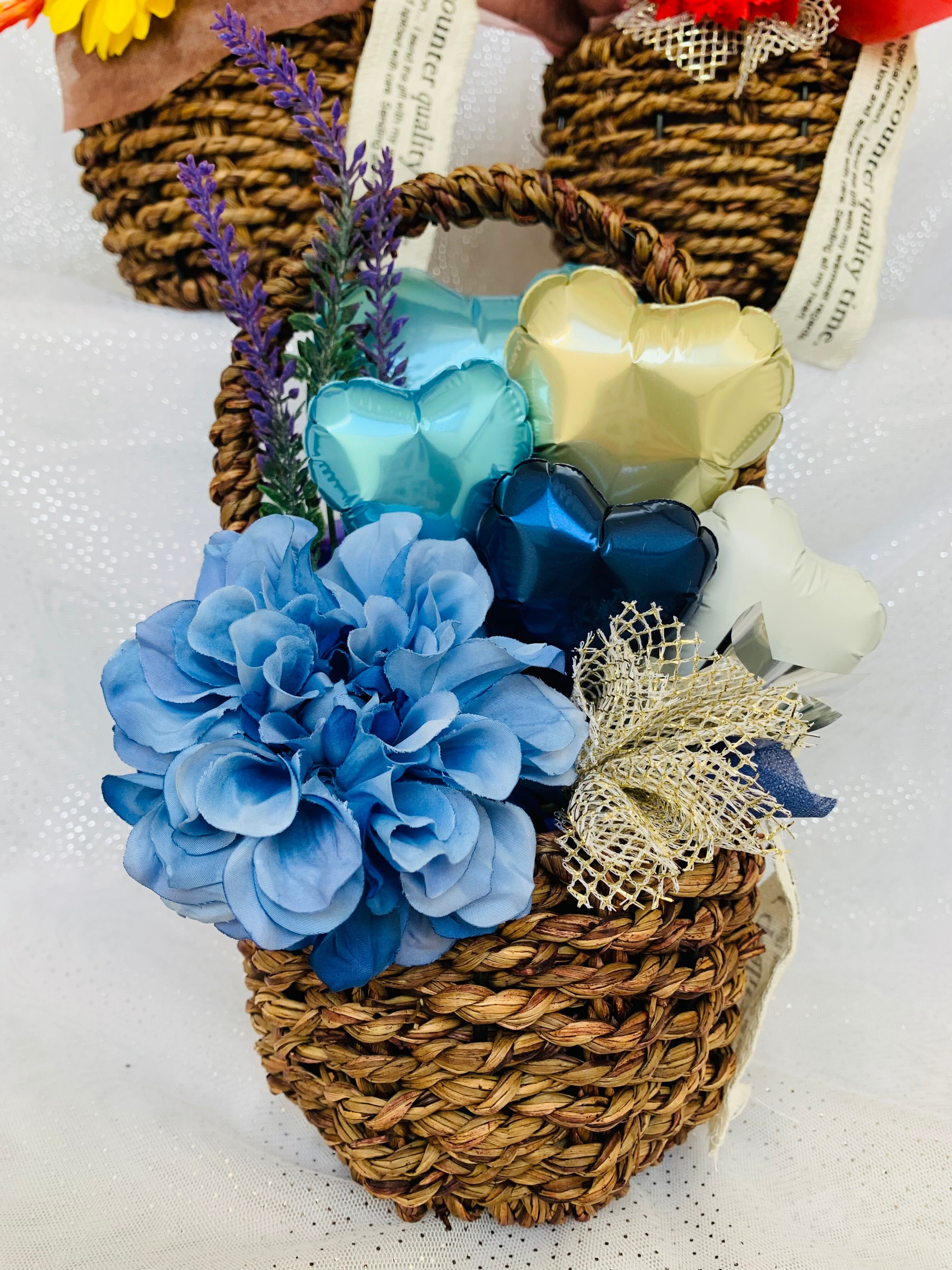 小さなバスケットにバルーンとアーティシャフルフラワーを詰め込んだ卓上型アレンジメントです。