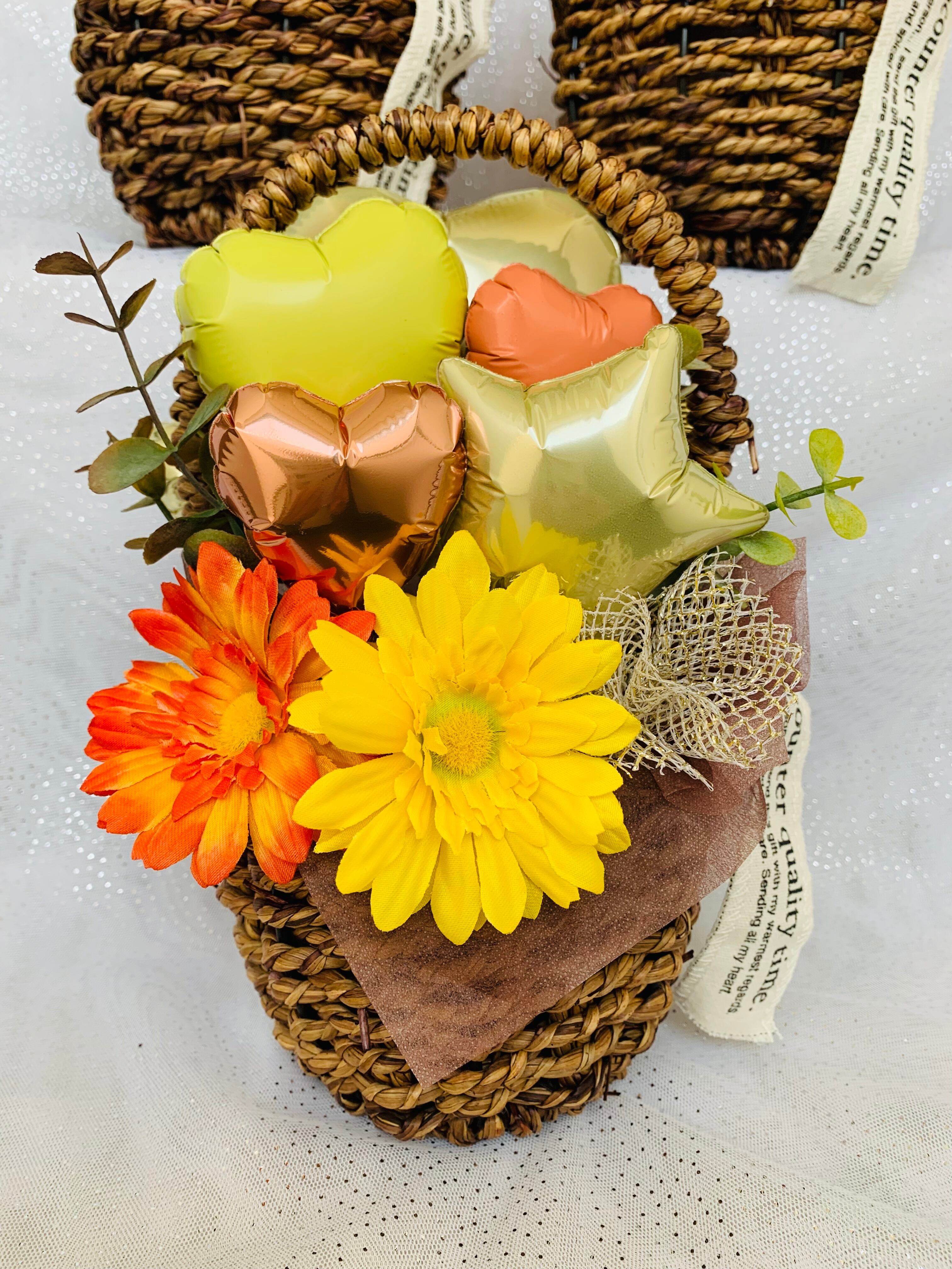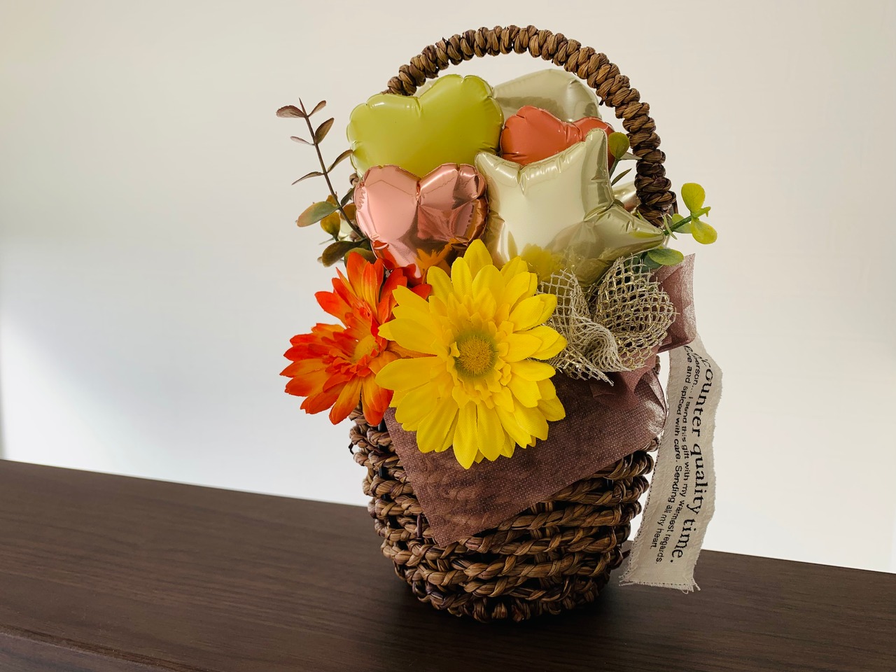 小さなバスケットにバルーンとアーティシャフルフラワーを詰め込んだ卓上型アレンジメントです。