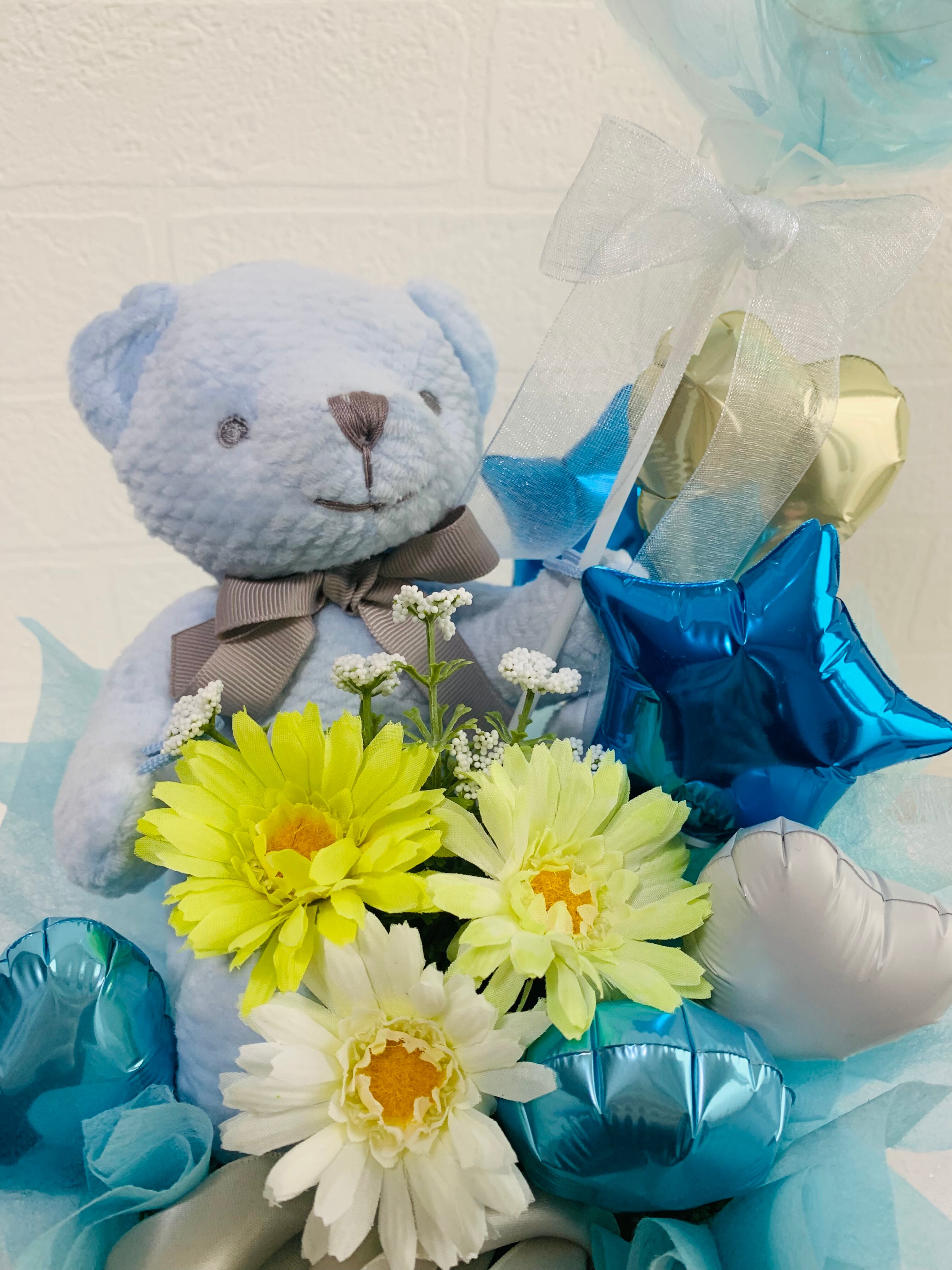 クマさんがバルーンを運んで来たような可愛らしいギフトとなっています。